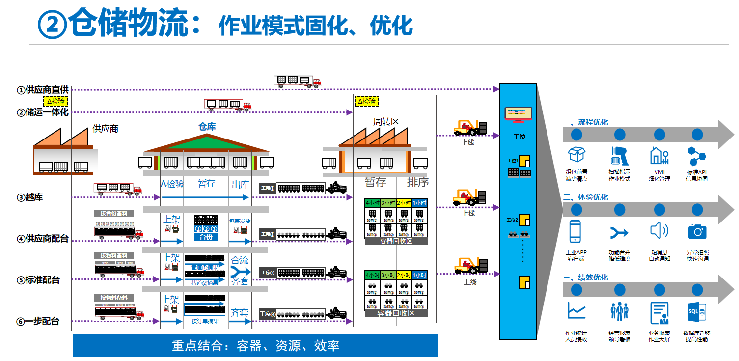 🔷 建立和优化了仓库,运输,上架,送货,检货,领料等等工序的标准作业流程,力争在整个流程减少浪费,最大化精益。